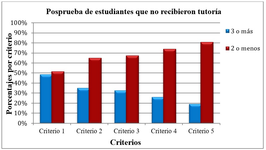 Figure 5 presents the distribution of “3 or more” and “2 or fewer” scores on the posttest for students who did not receive tutoring. The pattern tends to be concentrated in “2 or fewer” across the criteria, which contrasts with the profile of the tutored group and suggests a practical difference in the assessed domain.